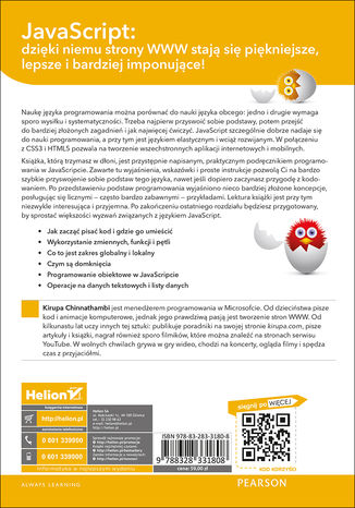 Naukę języka programowania można porównać do nauki języka obcego: jedno i drugie wymaga sporej ilości wysiłku i systematyczności. Trzeba najpierw przyswoić sobie podstawy, potem przejść do bardziej złożonych zagadnień i jak najwięcej ćwiczyć. JavaScript szczególnie dobrze nadaje się do nauki programowania, a przy tym jest językiem elastycznym i wciąż rozwijanym. W połączeniu z CSS3 i HTML5 pozwala na tworzenie wszechstronnych aplikacji internetowych i mobilnych.Książka, którą trzymasz w dłoni, jest przystępnie napisanym, praktycznym podręcznikiem programowania w JavaScripcie. Zawarte tu wyjaśnienia, wskazówki i proste instrukcje pozwolą Ci na bardzo szybkie przyswojenie sobie podstaw tego języka, nawet jeśli dopiero zaczynasz przygodę z kodowaniem. Po przedstawieniu podstaw programowania wyjaśniono nieco bardziej złożone koncepcje, posługując się licznymi -- często bardzo zabawnymi -- przykładami. Lektura książki jest przy tym niezwykle interesująca i przyjemna. Po zakończeniu ostatniego rozdziału będziesz przygotowany, by sprostać większości wyzwań związanych z językiem JavaScript