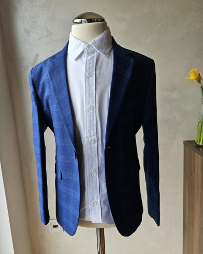 Granatowa, jednorzędowa marynarka chłopięca w modną kratę. Całość na podszewce. Z przodu 1 kieszonka na klatce piersiowej oraz 1 kieszonka od środka marynarki.