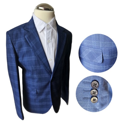 Granatowa, jednorzędowa marynarka chłopięca w modną kratę. Całość na podszewce. Z przodu 1 kieszonka na klatce piersiowej oraz 1 kieszonka od środka marynarki.