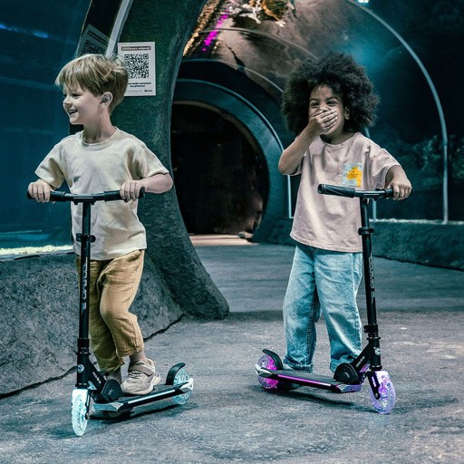 Z Movino Cosmo2 twoje dziecko zapomni o nudzie . Za pomocą jednego przycisku zmienia się w pojazd jak z innej planety. Światła wbudowane w podest gwarantują niesamowitą zabawę i zachwycą nie tylko dziecko. Możliwy jest wybór jednego z 7 dostępnych kolorów oświetlenia. Hulajnoga przeznaczona jest dla dzieci w wieku od 5 do około 8 lat. Wielkość hulajnogi została tak dobrana, aby małym użytkownikom jeździło się na niej wygodnie.