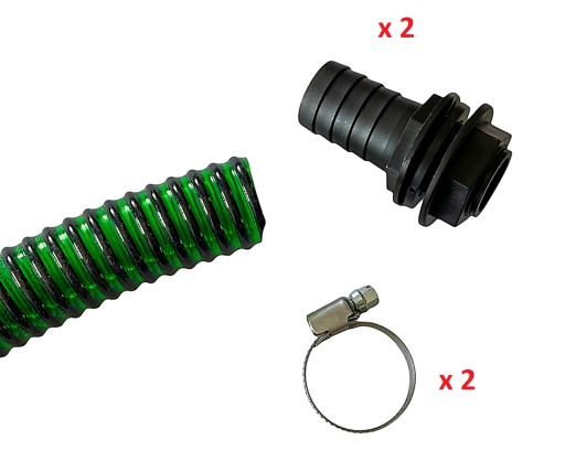 W ZESTAWIE DWIE KOŃCÓWKI DO ŁĄCZENIA BECZEK, WĄŻ O ŚREDNICY WEWNĘTRZNEJ 25mm I długości 30cm W KOLORZE ZIELONYM, ORAZ DWIE OPASKI.
