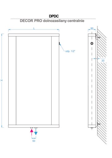 Grzejniki DECOR PRO zasilane są z dołu centralnie. Przyłącze jest nieruchome: blok przyłączeniowy w osi grzejnika, zasilanie/powrót – dowolnie, rozstaw przyłączy – 50 mm. Gwint wewnętrzny ½ ‘’
