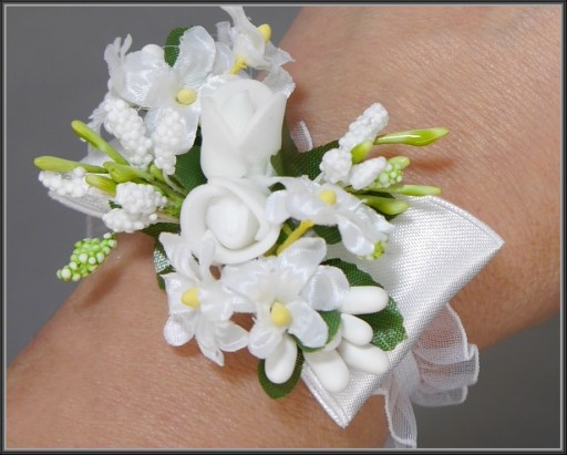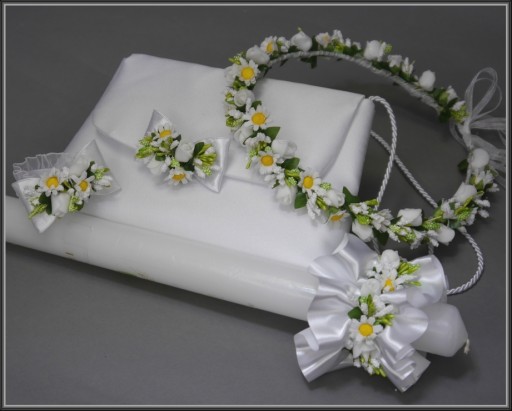 Komplet komunijny: Bransoletka na jedną rączkę, rękawiczki gładkie zakładane na jeden paluszek, torebka satynowa w kształcie woreczka z wkładką pomagającą w zachowaniu kształtu nawet po obciążeniu. Ozdobiona stroikiem z drobnymi kwiatkami. Woreczek został uszyty z pierwszego gatunku satyny ślubnej. Na pozostałych aukcjach można kupić każdy produkt osobno lub torebkę prostokątną i wianek. Cena nie zawiera świecy!