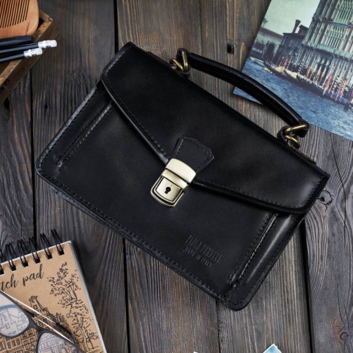 Kuferek wykonany we Włoszech, z wysokogatunkowej skóry licowej. Zapinany klamrą typu tic-tac, posiada opcję zamykania na kluczyk. Pojemne wnętrze kuferka składa się z komory głównej, dzielonej na trzy przegrody. Dodatkowo, kuferek posiada frontową kieszeń wsuwaną pod klapą oraz tylną kieszonkę na suwak. Produkt można nosić w dłoni lub przypiąć pasek na ramię.