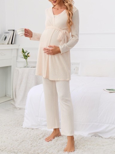 KREMOWY PRĄŻKOWANY KOMPLET CIĄŻOWY TOP SZLAFROK DŁUGIE SPODNIE SHEIN 38