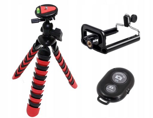 W skład zestawu wchodzi giętki statyw gorilla, końcówka umożliwiająca montaż smartfonu na statywie i pilot bluetooth do zdalnego wyzwalania migawki w telefonie.