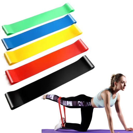 Zestaw zawiera 5 gum oporowych do ćwiczeń:
