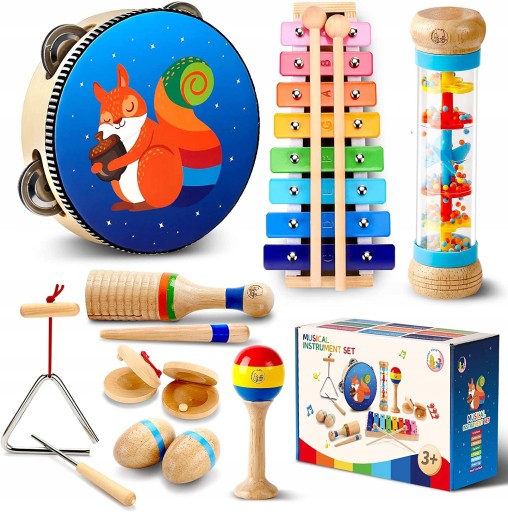 Ten zestaw 12 różnych instrumentów perkusyjnych to fajny zestaw startowy dla dzieci.