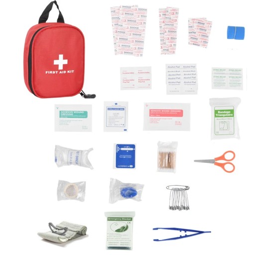 First Aid Bag, Israel strap, First aid blanket, Scissor, Tweezer, Tourniquet, Safety pins, Elastic bandage, Adhesive tape, CPR mask,Band-aids, Round band-aids, Mini band-aids, Iodine pad, Alcohol prep pad, Mosquito repellent pad, Wound dressing, Sterile gauze pad, First aid kit instructions.