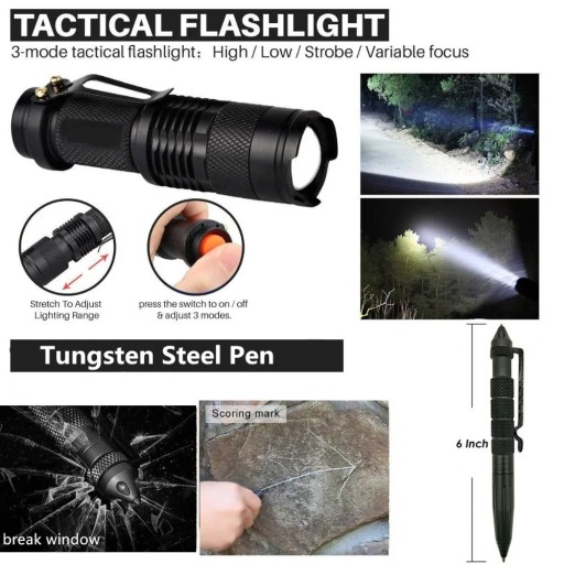 Our 12-in-1 survival kit includes the a emergency blanket, emergency window breaker and flashlight, wire saw, 7-in-1 spork, pocket bellow, tactical pen, water bottle clip, tactical knife, saber card. In addition to that, we have also added a high-strength multi-use paracord bracelet that has a whistle and fire-starter making it the perfect tool for emergency situations.