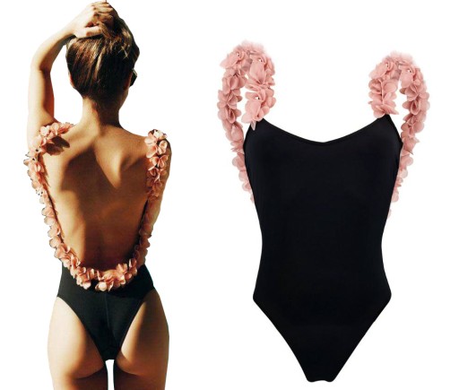 Jednoczęściowy kostium kąpielowy o klasycznym kroju z ozdobnymi kwiatami na plecach.