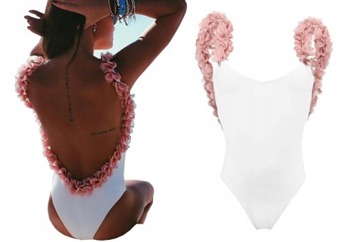 Strój posiada seksownie, głęboko wycięte plecy z ozdobnymi różowymi kwiatami. Doskonale podkreśla atuty sylwetki, ukrywając przy tym jej wszelkie niedoskonałości.