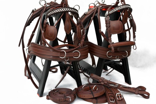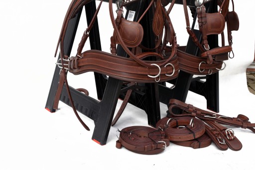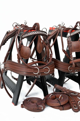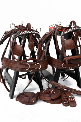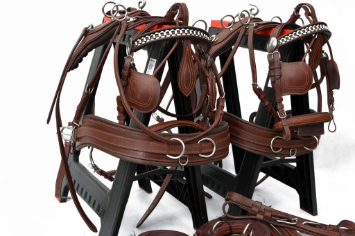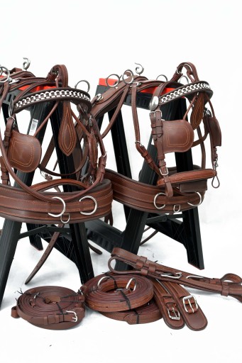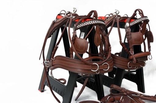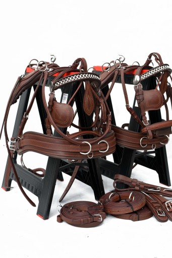 Uprząż na parę koni roz.FULL . Uprząż wykona w całości bardzo dobrej selekcjonowanej skóry licowej ,bardzo miękkiej i miłej w dotyku ,we wszystkich elementach uprzęży wszyta taśma ,która ma zadanie wzmocnienie skóry.Profilowane piersi wyposażone w napierśniki ,popręgi anatomicznie profilowane ogłowia anatomiczne w części potylicznej i nachrapnik zrobiony na miękko Okucia wykonane ze stali nie rdzewnej .jedyna taka uprząż na rynku ,perfekcyjnie wykonanie.Polecam