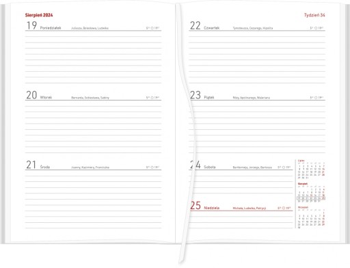 - kalendarium w układzie dziennym (jeden dzień na stronie, sobota i niedziela razem) na okres od września 2024 do czerwca 2025 r.