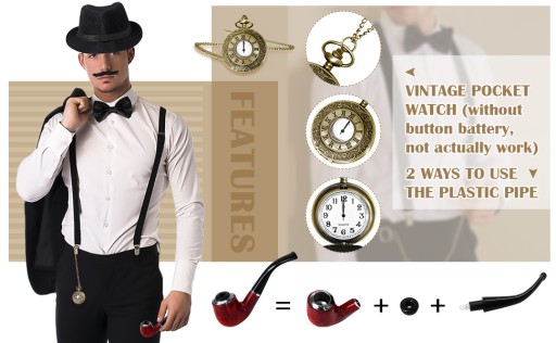 Idealny na organizację w stylu Wielkiego Gatsby'ego. Zabawkowy zegarek kieszonkowy wygląda realistycznie, ponieważ ma znaczenie i małe zapięcie, dzięki czemu można go wykryć jak prawdziwy zegarek kieszonkowy. Cygaro-zabawka jest również wyposażona w zabawkę, dzięki której można uzyskać dostęp do klimatu dwudziestych XX wieku.
