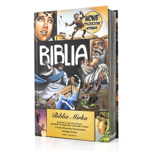 Nowe poszerzone wydanie Pisma Świętego dla dzieci jest bestsellerem na rynku światowym. Biblia w komiksie dzięki dynamicznym i barwnym ilustracjom rysownika Marvela i DC Comics oraz przystępnym dialogom wychodzi naprzeciw nie tylko potrzebom dzieci i młodzieży, lecz również wymagajacych dorosłych. Wydanie posiada dodatkowe 128 stron i jest doskonałą propozycją prezentu na różne okazje: Pierwsza Komunia Święta, Dzień dziecka czy też prezent urodzinowy dla fana komiksu. Nowoczesny sposób przekazu rozwija wyobraźnię dzieci i pozwala im spojrzeć na biblijne postaci jako superbohaterów oraz przeżywać z nimi fascynujące przygody.
