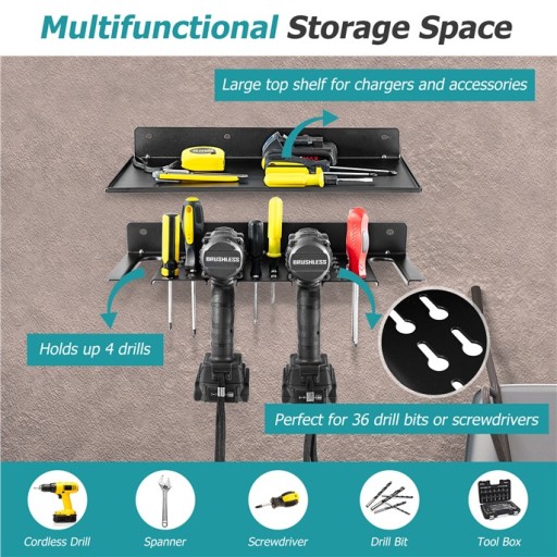 Jeśli chcesz wykorzystać przestrzeń narzędziową, należy zwrócić uwagę na nasz organizator na narzędzia elektryczne. Ten regał na wiertła jest wykonany z wysokiej jakości stali węglowej, o wysokiej wytrzymałości i wytrzymałości, może udźwignąć obciążenie 23 kg. Jego powierzchnia została powlekana, aby zapobiec rdzewieniu, zużyciu, wodzie i uszkodzeniu. Urządzenie składa się z 2, co zapewnia miejsce na narzędzia, takie jak wiertarka, śrubokręt. Można go podłączyć nie tylko na ścianie, ale również na płycie perforowanej, dzięki czemu można umieścić w magazynie, warsztacie, magazynie i innych miejscach.