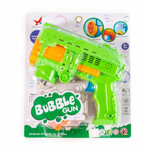 Pistolet umożliwia robienie dużej ilości baniek z dużą prędkością z efektem rozświetlenia. Wystarczy wlać dołączony do zestawu płyn i nacisnąć na włącznik - uzyskamy magie setek baniek mydlanych.