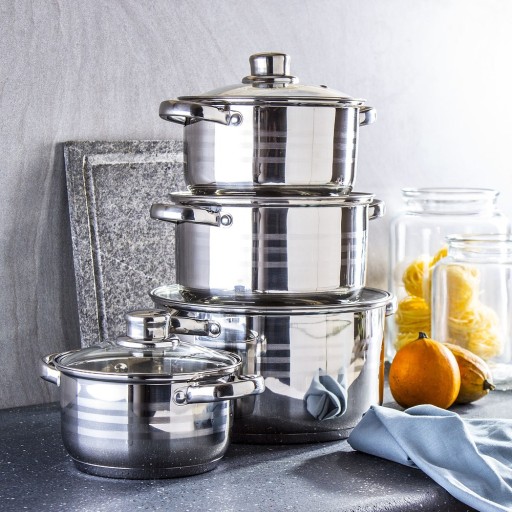 Zestaw zawiera praktyczne garnki różnych rozmiarów, wszystko wykonane ze stali nierdzewnej najwyższej jakości do codziennego gotowania.