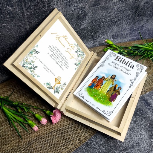 Biblia w drewnianym pudełku z nadrukiem. Pamiątka Pierwszej Komunii Świętej Prezent Komunijny