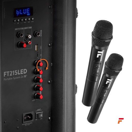 FT215LED jest wyposażony w dwa bezprzewodowe mikrofony ręczne. Efekt można ustawić dla obu mikrofonów. Trzeci mikrofon można podłączyć poprzez wejście mikrofonowe z tyłu. To dodatkowe wejście mikrofonowe jest wyposażone w funkcję „Mic Prio”, co oznacza, że muzyka automatycznie cichnie, gdy tylko ktoś zacznie mówić do mikrofonu. (Uwaga! Funkcja „Mic Prio” nie działa z dwoma dostarczonymi mikrofonami bezprzewodowymi).