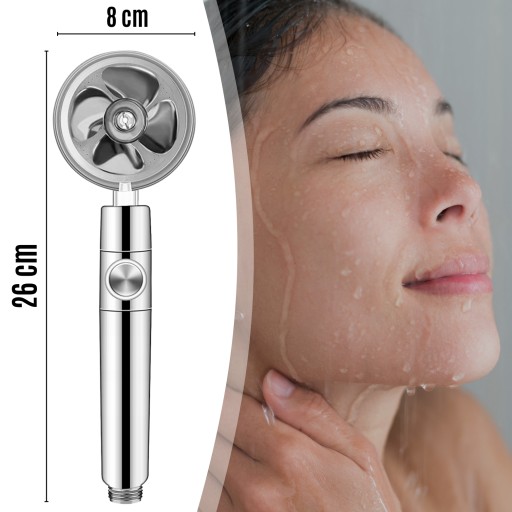 Nasza słuchawka prysznicowa wykorzystuje innowacyjną technologię turbinową z wentylatorem, która zwiększa prędkość przepływu wody bez potrzeby podnoszenia ciśnienia w instalacji. Dzięki temu możesz cieszyć się silnym i równomiernym strumieniem wody, zapewniającym głębokie oczyszczenie i relaksujący masaż.