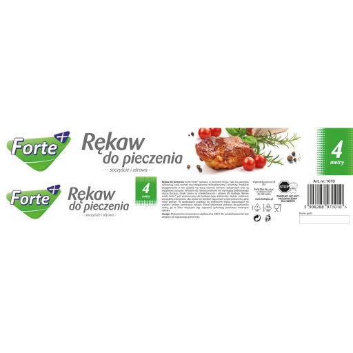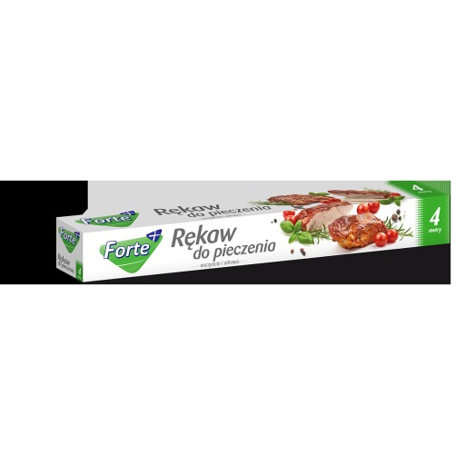 Rękaw do pieczenia 4m marki Forte+ sprawia, iż pieczone mięsa, ryby czy warzywa zachowują swój aromat oraz drogocenne mikroelementy i witaminy. Produkty przygotowane w ten sposób nie tracą również wartości odżywczych oraz są wyjątkowo soczyste. Włożone do rękawa produkty nie wymagają dodatkowego użycia tłuszczu, dzięki czemu są niskokaloryczne i zdrowe dla każdego. Rękaw marki Forte+ jest przeznaczony do każdego typu piekarnika. Należy zachować szczególną ostrożność, aby rękaw nie dotykał nagrzanych części piekarnika, gdyż może pęknąć. W opakowaniu znajdują się praktyczne klipsy, pozwalające na szybkie i proste zamknięcie rękawa. Przed włożeniem potrawy do piekarnika nakłuj go w kilku miejscach aby zapewnić cyrkulację powietrza wewnątrz rękawa.