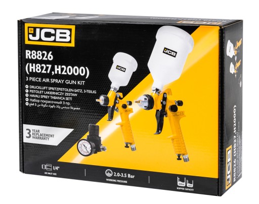 Wysokiej jakości zestaw pistoletów lakierniczych renomowanej marki JCB z osobnym reduktorem ciśnienia.