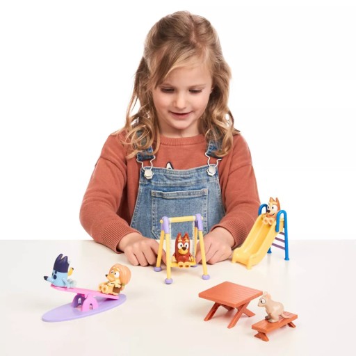 - Ten zestaw zabawek Bluey Park jest wyposażony w 3 zabawne akcesoria: huśtawka, zjeżdżalnia i obrotowy pojazd