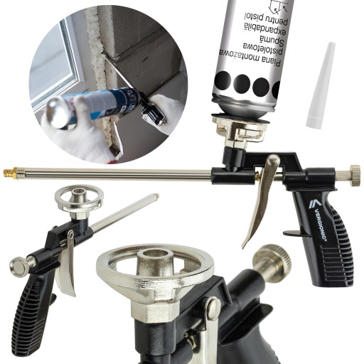 Pistolet do pianki montażowej ułatwia jej aplikację, oraz usprawnia pracę. Korpus pistoletu wykonany jest z metalu, lekki i nie daje dodatkowego obciążenia. Rękojeść z tworzywa sztucznego została specjalnie wyprofilowana aby pistolet nie wyślizgiwał się z ręki. Dodatkowo pistolet wyposażony został w pokrętło do regulacji strumienia piany. Zapewnia to kontrolę nad ilością piany podczas pracy. W zestawie dołączono plastikową dyszę umożliwiającą precyzyjną aplikację pianki.