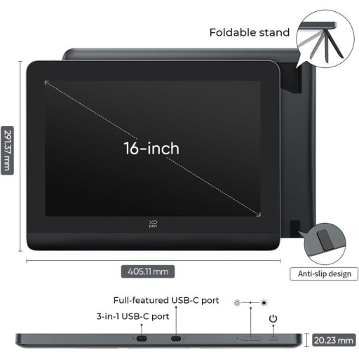 Tablet graficzny z 16-calowym wyświetlaczem IPS, 2560×1600, obszar aktywny 344,68×215,42 mm, 16384 poziomy nacisku, rozdzielczość warstwy wykrywania 5080 lpi