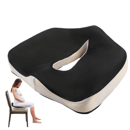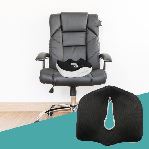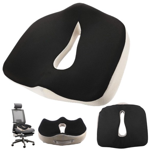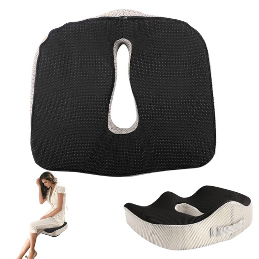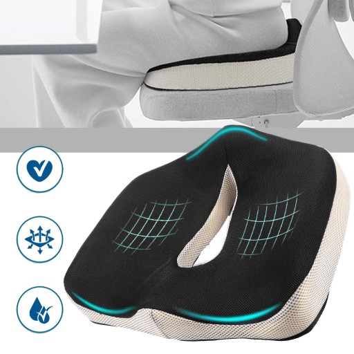 🪑 Poduszka ma niską część z przodu i wysoką z tyłu, dostosowując się do kształtu ciała. Dzięki pustemu wnętrzu redukuje nacisk na nerw kulszowy i łagodzi bolesne hemoroidy.