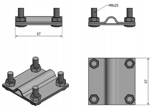 - Uchwyt ocynkowany czterośrubowy (4xM8) uziom-bednarka-drut