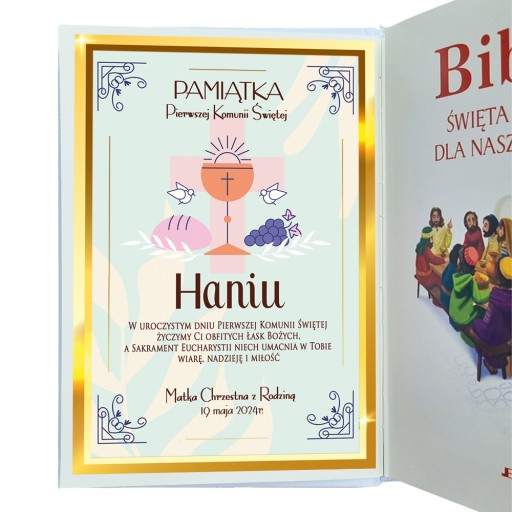 Każda Biblia posiada wybrane przez Ciebie spersonalizowane życzenia, dzięki czemu pozostanie ona pamiątką na wiele lat. Życzenia znajdują się na pierwszej stronie po otwarciu obok tytułu oraz autora.