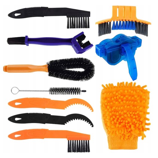 10-częściowy zestaw do czyszczenia roweru. Rodzaje szczotek obejmują skrobaki do czyszczenia zębatek, szczotki do kół zębatych i szczotki do detali. Dzięki ergonomicznie zaprojektowanemu uchwytowi odpowiedniemu do różnych części roweru, każdą szczotkę można wygodnie trzymać.
