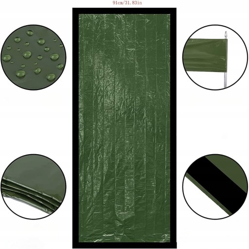 Śpiwór składa się z aluminiowej folii PE (grubość: 0,026 mm, waga: 110 g), jest lekki, wodoszczelny i łatwy do przenoszenia; można go używać w pudełku pierwszej pomocy, zestawem survivalowym lub schowku samochodowym.