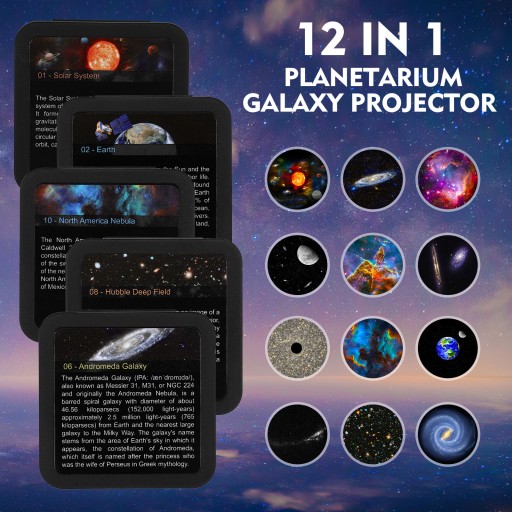 - razem z projektorem dostajesz 12 wkładów, które możesz zmienić w trakcie wyświetlania różnych planet, mgławic, zorzy i innych ciekawych efektów!