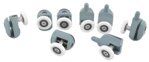 Zestaw rolek górnych i dolnych do kabiny prysznicowej wraz z zaślepkami oraz odbojnikami. Rolka górna posiada regulowany element wpinający. Rolki zamocowane są na łożyskach, są odpowiednie dla szyby o grubości 4-6 mm, pasują do różnego rodzaju kabin prysznicowych.