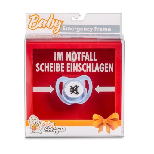 Produkt można postawić lub powiesić na ścianie. Napis na produkcie: Im Notfall Scheibe einschlagen. Produkt w niemieckiej wersji językowej. Materiał: ABS pokryty gumowaną powłoką. Wymiary: 14 cm (wysokość), 5 cm (długość), 14 cm (szerokość). Wymiary w opakowaniu: 5,5 x 14,5 x 14,5 (cm). Waga: 0,23 kg. Uwaga: smoczek nie nadaje się do użycia.