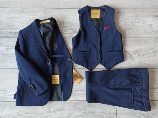 Zestaw zawiera 3 częściowy garnitur marka Kwella (marynarka, spodnie, kamizelka), do każdego zestawu dodaję koszulę i muszkę