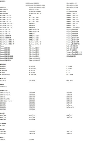 - HANSEATIC: 1400 Compact, 1500 Compact, 1500 SL, 1600 Aero Plus, 1600 Silver Power, 202.815, 202.971, 234.124, 235.748, 239.087, 239.124, 269.440, 288.461, 289.769, 289.772, 313.695, 354.932, 390.743, 393.050, 429.918, 880.037, 880.343, 887.510, 887.917, La Palma, La Palma SL