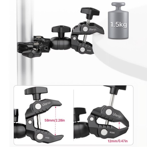 Podwójne imadło umożliwia montaż akcesoriów fotograficznych takich jak parasolki, statywy, selfie sticki, softboxy, lampy LED do wszelkiego rodzaju profili, belek, rurek o średnicy od 12 do 58 mm.