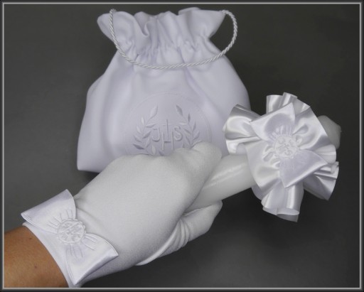 Torebka komunijna wykonana z tkaniny Panama / Strecz. Jest to materiał który najczęściej jest wykorzystywany do uszycia alby komunijnej. Torebka została ozdobiona białym sznureczkiem i aplikacją IHS. Na pozostałych aukcjach produkt ten można kupić w zestawie z rękawiczkami i okapnikiem.