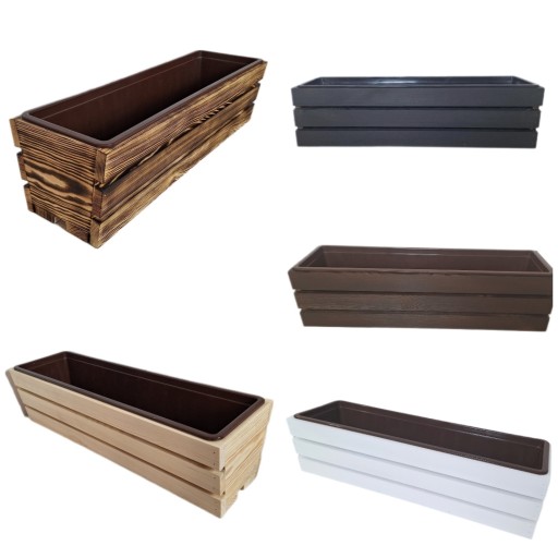 Drewniana skrzynka, doniczka, na kwiaty i zioła idealna do ogrodu, a także na balkon, czy parapet wraz z pasującym wkładem plastikowym w kolorze ciemny brąz.