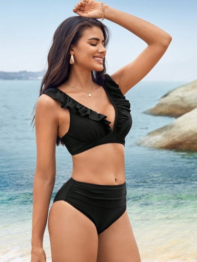 SHEIN STRÓJ KĄPIELOWY DAMSKI DWUCZĘŚCIOWY Z FALBANKĄ CZARNY L