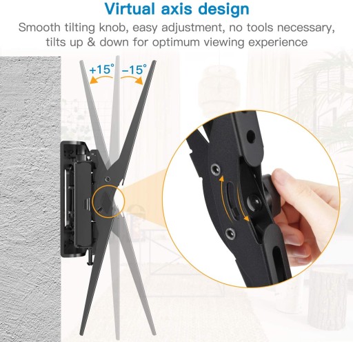 - Optymalny Kąt Widzenia – Ten uchwyt ścienny do telewizora oferuje kąt nachylenia +15° / -15°, kąt obrotu +/- 90° (maksymalny kąt obrotu zależy od rozmiaru telewizora) i regulację poziomu +/- 3° dla maksymalnej elastyczności widzenia i personalizacji swych wyjątkowych wrażeń z oglądania.