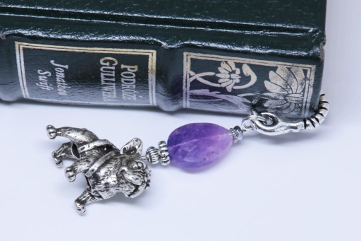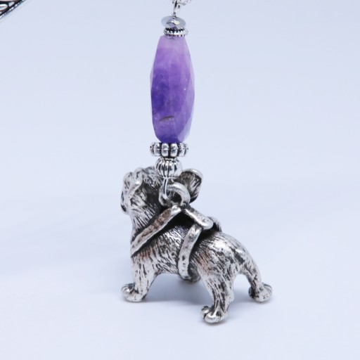 Elegancka zakładka do książki z zawieszką w kształcie buldoga francuskiego z dodatkiem ametystu oraz srebrnego hematytu.
