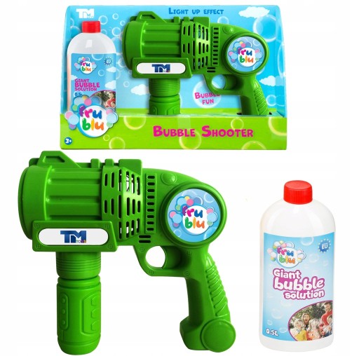 Zielony pistolet do baniek umożliwia robienie dużej ilości baniek z dużą prędkością z efektem rozświetlenia. Napełnij zbiorniczek płynem i naciśnij spust, by z pistoletu wystrzelił strumień baniek. Bańki przybierają ogromne rozmiary i fantastyczne kształty. Mienią się wszystkimi kolorami tęczy, tak łatwo nie pękają!