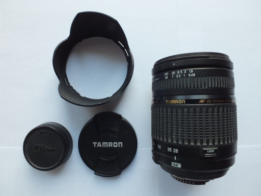 - Tamron AF Aspherical XR DI 28-300 mm 1:3.5-6.3 VC + przedni i tylny dekielek oraz osłona przeciwsłoneczna