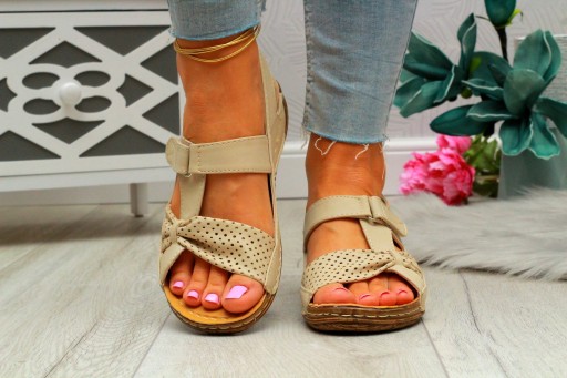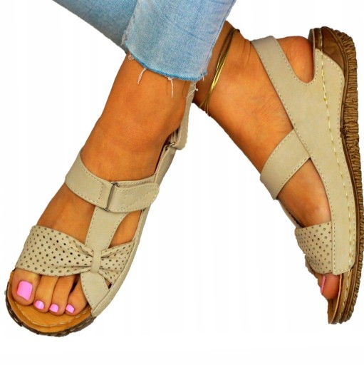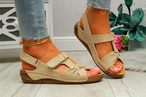 Damskie sandały na grubej podeszwie w kolorze beżowym. Komfortowa, profilowana wkładka sprawia, że idealnie nadają się do codziennego użytkowania. Prosty fason dopasuje się do wielu stylizacji. Zapięcie na rzep ułatwia zakładanie❗ Szyta podeszwa skutkuje dłuższą wytrzymałością obuwia.